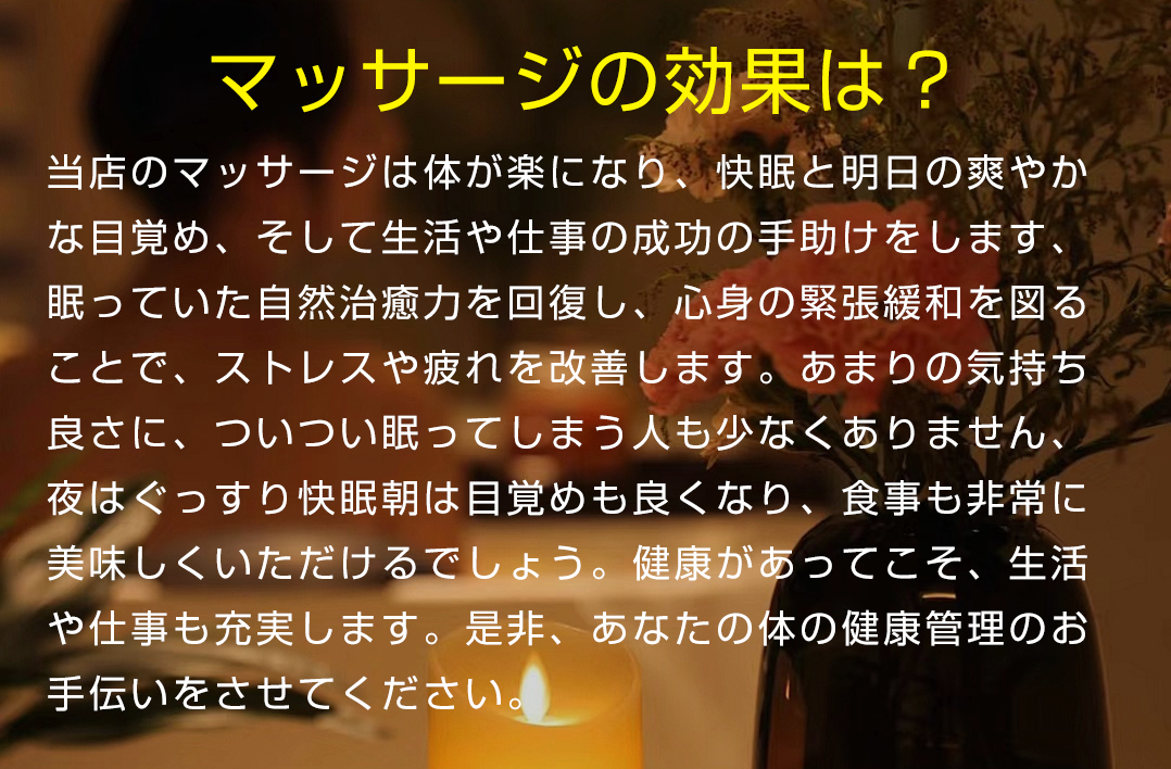 この度は、数あるリラクゼーションの中に、当店のホームページをご覧頂き、誠にありがとうございます。リピート率90%以上を誇る当店では、経験豊富なセラピストの『洗練された施術スキル』と『お客様目線の心温まる接客』が今までお客様からご支持を頂いてきました、ご来店を心よりお待ち申し上げます。